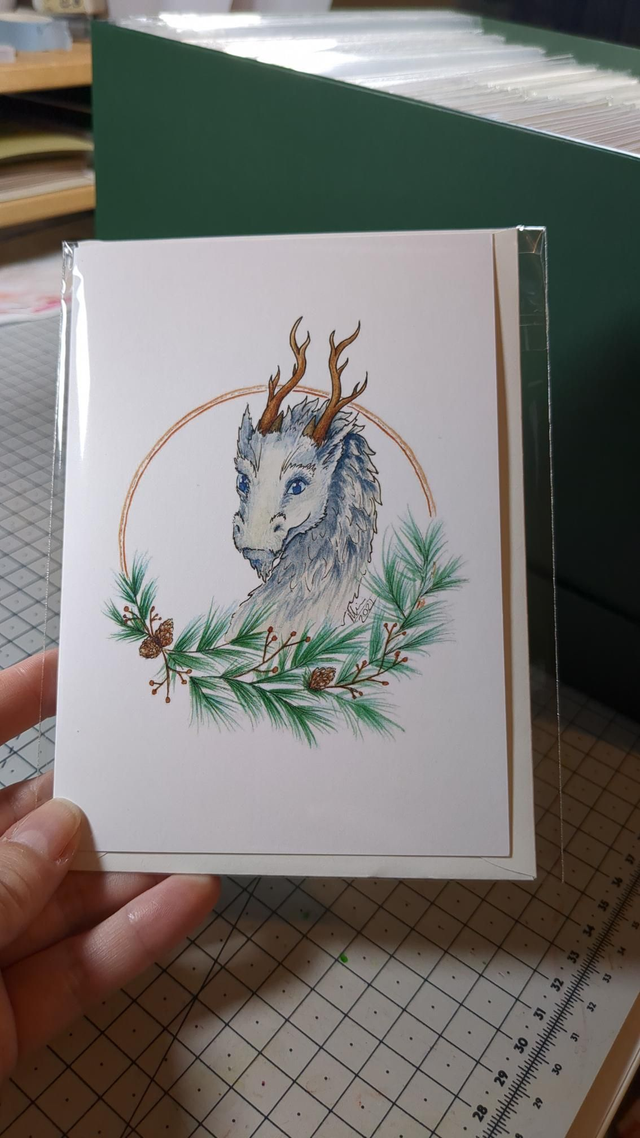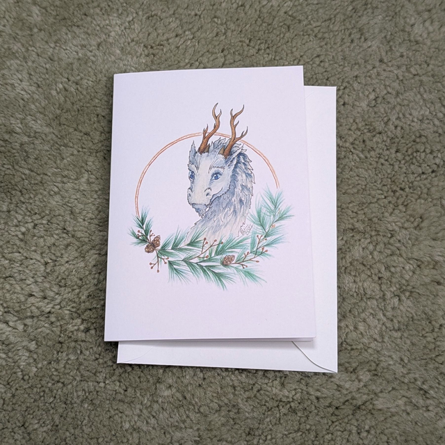 A greetings card featuring my 'Boreal' (or 'Winter Floof!') dragon portrait artwork.